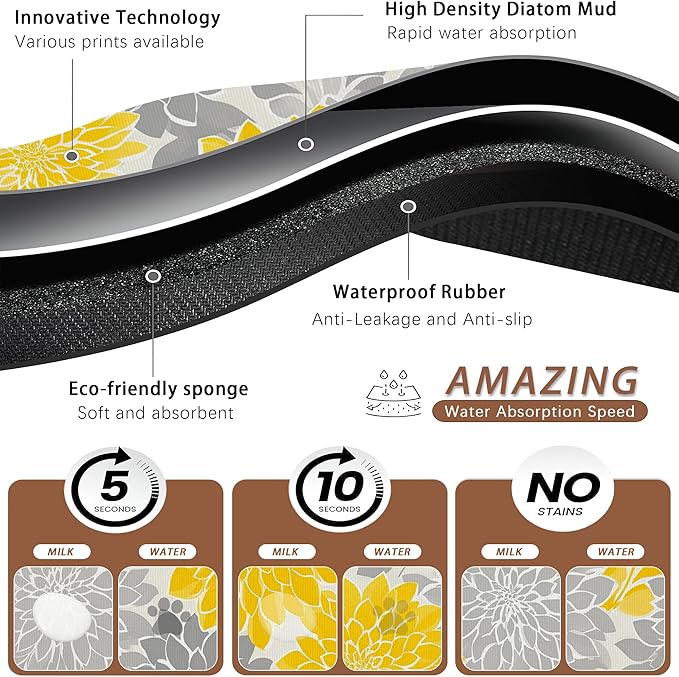 - Absorbent: This Dahlia Gray Yellow Flower pattern pet food mat helps prevent liquid spills and keeps your pet's eating area clean, making it a practical addition to your pet supplies. It helps keep paws dry even for pets who love to drink water. The sturdy design is resistant to tearing and helps prevent accidental ingestion.
