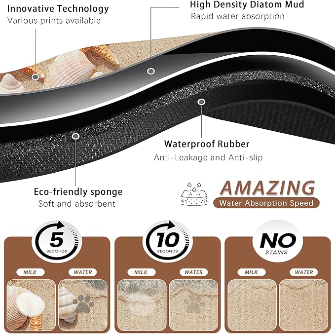 - Absorbent: This Beach Starfish Cute Seashell pattern pet food mat helps prevent liquid spills and keeps your pet's eating area clean, making it a practical addition to your pet supplies. It helps keep paws dry even for pets who love to drink water. The sturdy design is resistant to tearing and helps prevent accidental ingestion.