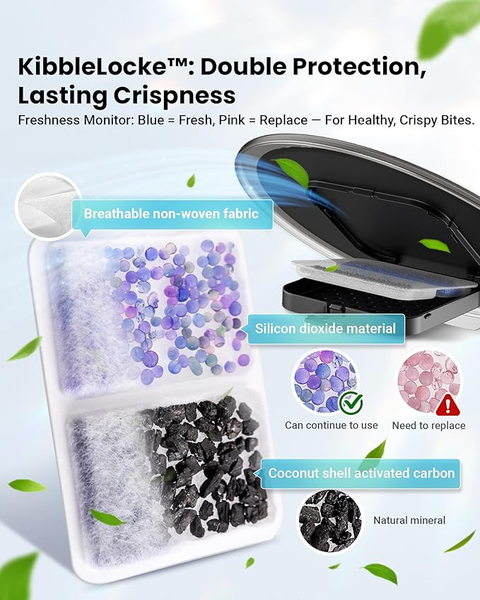 - Keeps Food Fresh Longer: This cat feeder automatic built-in dual desiccant system helps lock in freshness and flavor. With a color indicator, you’ll always know when it’s time to replace for the best-tasting meals your cat deserves. The cat feeder also comes with 3 pet food desiccant bag to keep your pet’s food crisp and tasty for months without worrying about running out.