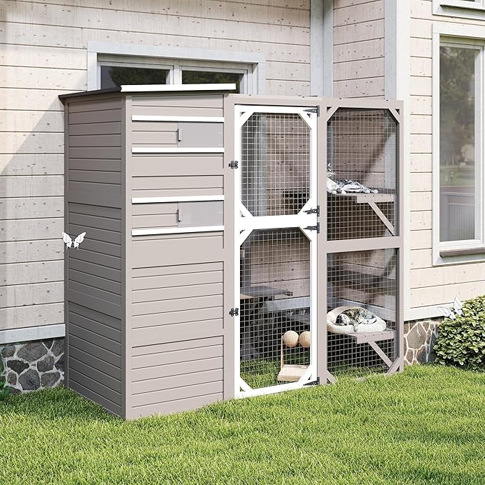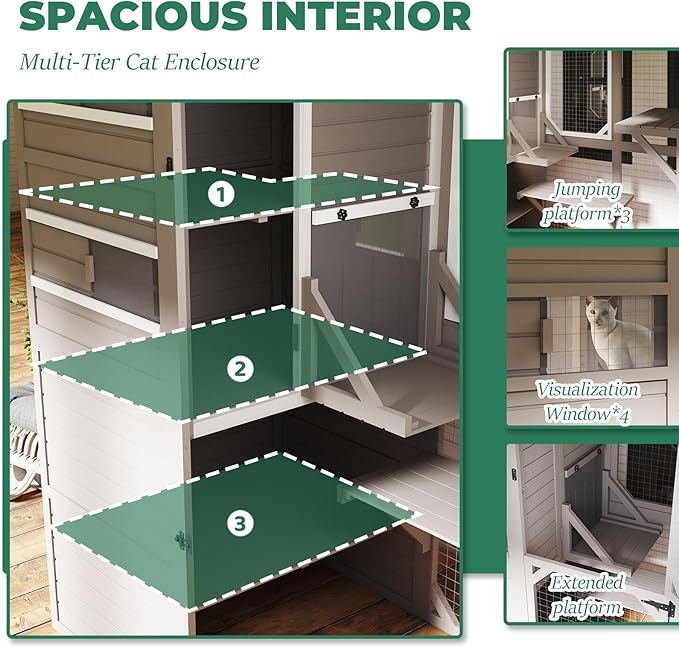 - Multi-Level Catio: Our large catio features 4 spacious levels + 3 jumping platforms in this outdoor cat enclosure, creating the ultimate vertical playground. The tiered outdoor cat house design provides perfect spots for food bowls and toys while encouraging healthy climbing