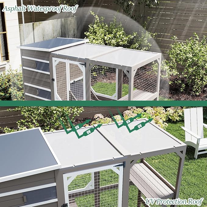 - All-Weather Catio: This weatherproof outdoor cat house features waterproof asphalt roof + sun panels. The included sleeping house makes this large catio perfect for year-round outdoor enjoyment