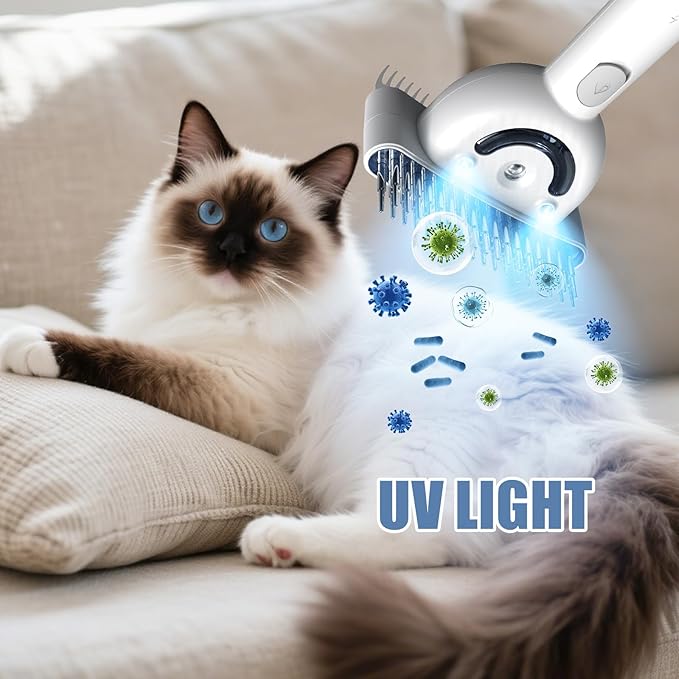- 【5-In-1 Multi-Functional Dematting & Deshedding Comb & Steam Brush】- Combining multiple functions in one product: Pet steam brush, Dematting comb, Deshedding comb, Massage comb, Undercoat detangling rake. One product meets all your pet grooming needs. The 2 UV lights equipped can also help illuminate and remove some Harmful substances.