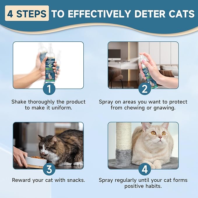 - Long-Lasting & Reliable: Enjoy extended protection with our cat deterrent spray. Start with 3–4 applications daily, then reduce to once per day or as needed. Trusted by pet owners and recommended as a humane solution, it offers long-lasting peace of mind and a well-maintained home.