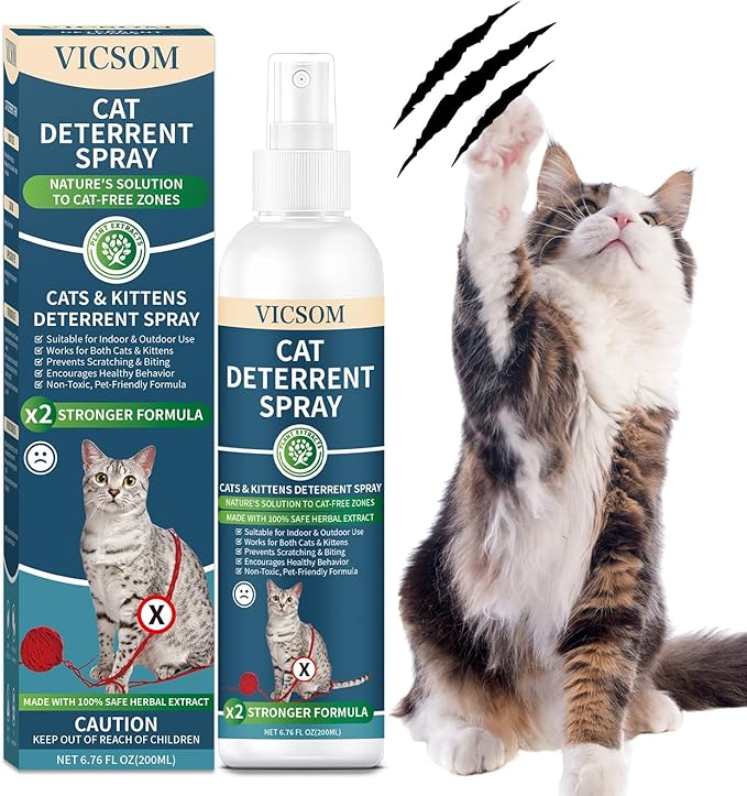 VICSOM Cat Deterrent Spray, Natural Cat Repellent Spray, Cat Scratch Deterrent for Furniture, Sofas, Rugs, Curtains, Plants, Indoor & Outdoor Keep Cats Kittens Away, No Alcohol & Trace 6.76 FL Oz