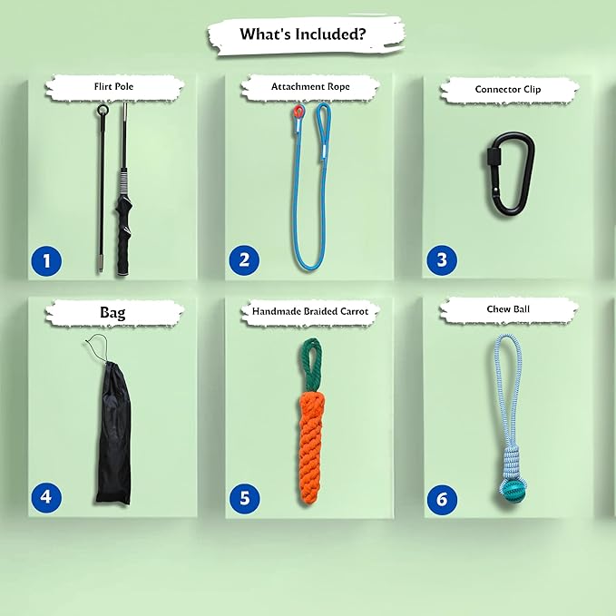 - COMPLETE TOY SET: This all-in-one set includes a telescoping flirt pole, attachment rope, connector clip, carry bag, braided carrot, and a durable chew ball. These dog toys for large breeds and puppies provide a variety of stimulating options, ensuring your furry friend gets the best out of every play session.