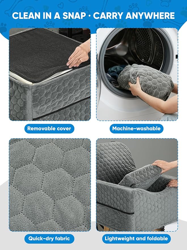 - Multi-Use & Easy Clean – Doubles as a portable pet bed for home, camping, or travel, with side storage pockets for treats and toys. The removable, machine-washable cover and quick-expand memory foam make maintenance effortless—just unzip, wash, and go!