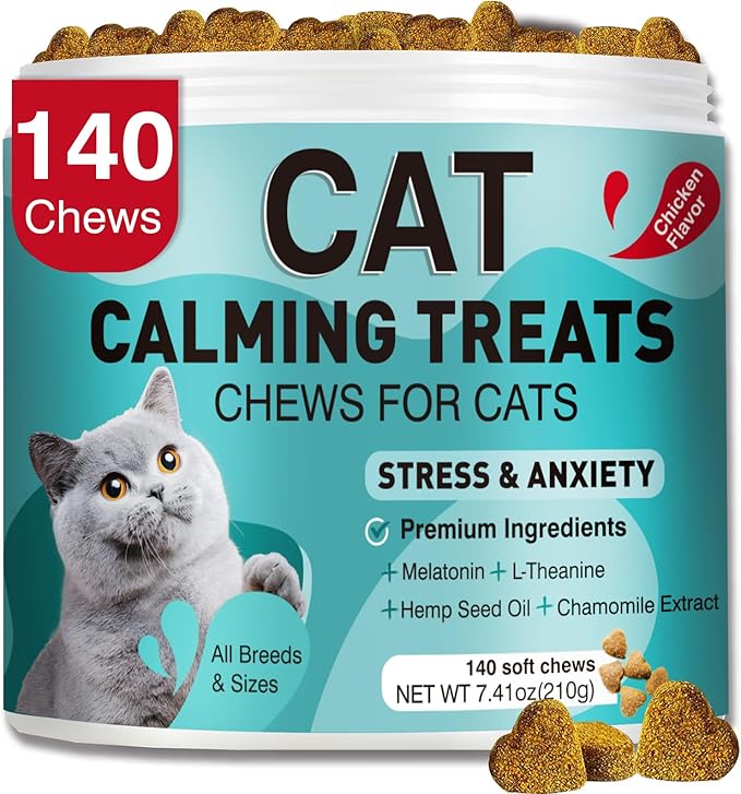 Cat Calming Treats, 140 Soft Chews to Relieve Anxiety, Stress & Prevent Bites, Perfect for Travel & Veterinary Visits, Soothing Calming Care for Indoor Cats Chicken Flavor 7.41 OZ