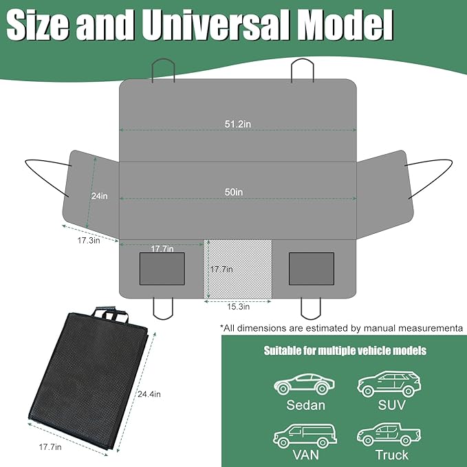 - 【Universal Size for Cars】It”s about 53.15*46.46 in of the dog car seat cover, it will fit for most standard cars, trucks and SUVs,including baby car seats. It can protect your back car seat from being messed up, scratched or getting dirty, etc.