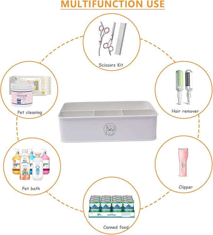 - 【Dimensions】- 12.6" L x 6.7" W x 3.5" H(32x17x9cm). Rectangular divided pet storage caddy with handles . Features 1 large compartment (Ideal for conditioner, bottles, dryers) + 3 small compartments (Perfect for scissors, combs, brushes, nail trimmers) – keep all tools sorted and within reach.