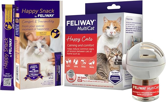 - FELIWAY, YOUR CAT CALMING SOLUTION: FELIWAY offers a full range of cat wellbeing products. Create your cat calming routine with a FELIWAY MultiCat plug in diffuser for enhanced serenity, and Happy Snack, a delicious lickable puree for a daily calming moment with your cat