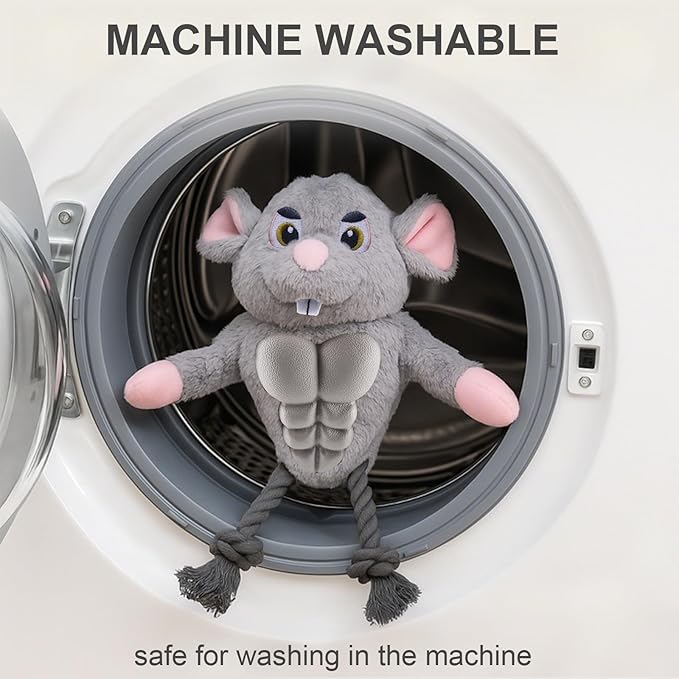 - 1. Unique Muscle Mouse Design with Rope Legs This plush gray mouse combines a hilarious rubber six-pack chest with durable knotted rope legs, creating a fun contrast that sparks your dog’s curiosity. It’s not just a cuddle buddy – it’s a one-of-a-kind interactive toy built for lasting fun.