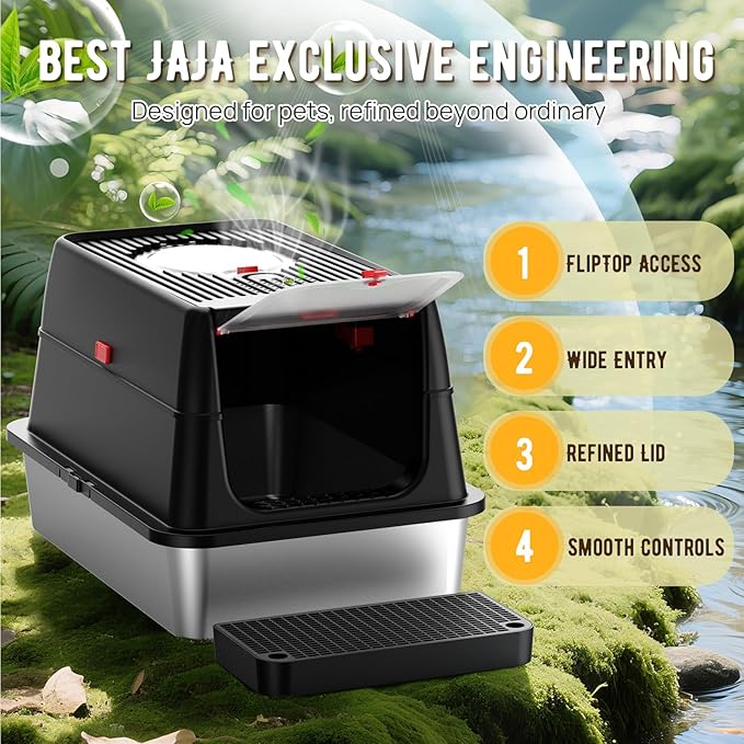 - Unique Flip-Top Design for Effortless Cleaning: Tired of struggling with bulky lids during cleaning? Our upgraded stainless steel enclosed litter box features a 180° flip-top lid, so you can easily scoop without removing the whole lid. No more awkward angles or hard-to-reach corners. Just press the button, lift, and clean it