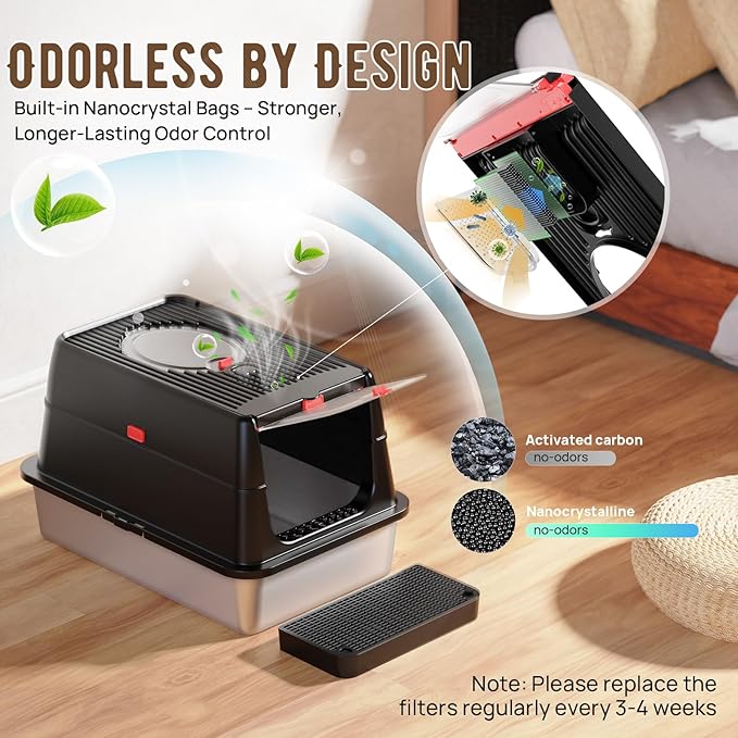 - Odorless & Residue-free Stainless Steel Litter Box: Crafted from high-quality SUS304 stainless steel, this odor-resistant litter box outperforms plastic litter box with its leak-proof, scratch-resistant design, our seamless stainless steel base prevents leaks and eliminates sticky residue. The ultra-smooth non-porous surface resists stains and odors while allowing quick-drying after cleaning - no more scrubbing or waiting for it to dry