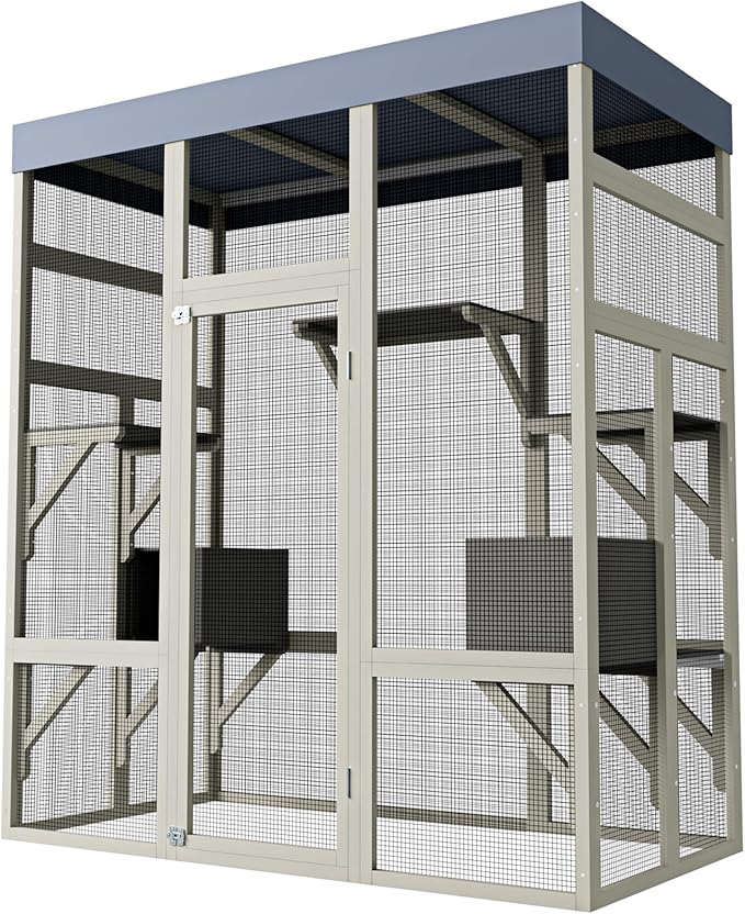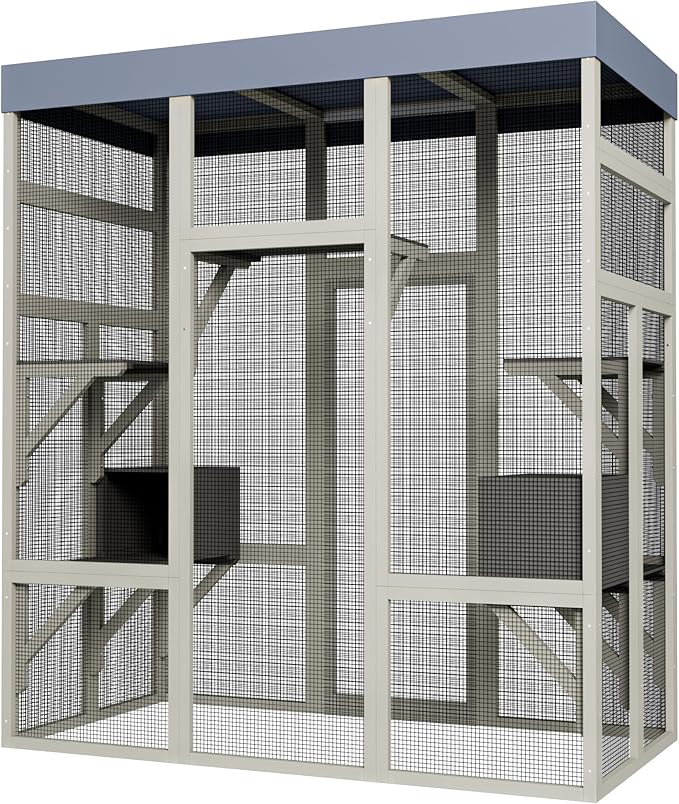 - 【Spacious Outdoor Catio】This 70.1" tall wooden cat enclosure offers plenty of space for multiple cats to climb, play, and relax safely outdoors. Ideal for backyards, patios, or balconies.