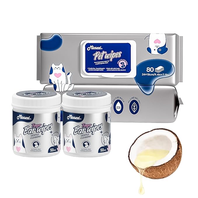 - 【Safe & Effective】 MIOSSZI pet cleaning wipes for dogs are made of 99% natural ingredients, including deeply nourishing fermented coconut oil extract, soothing aloe extract, calming witch hazel extract and stabilizing vitamin E. They are alcohol-free and hypoallergenic, gently remove dirt and odor, and reduce tear marks. The formula has a balanced pH value, which is effective and clean, and will not cause irritation or dryness.